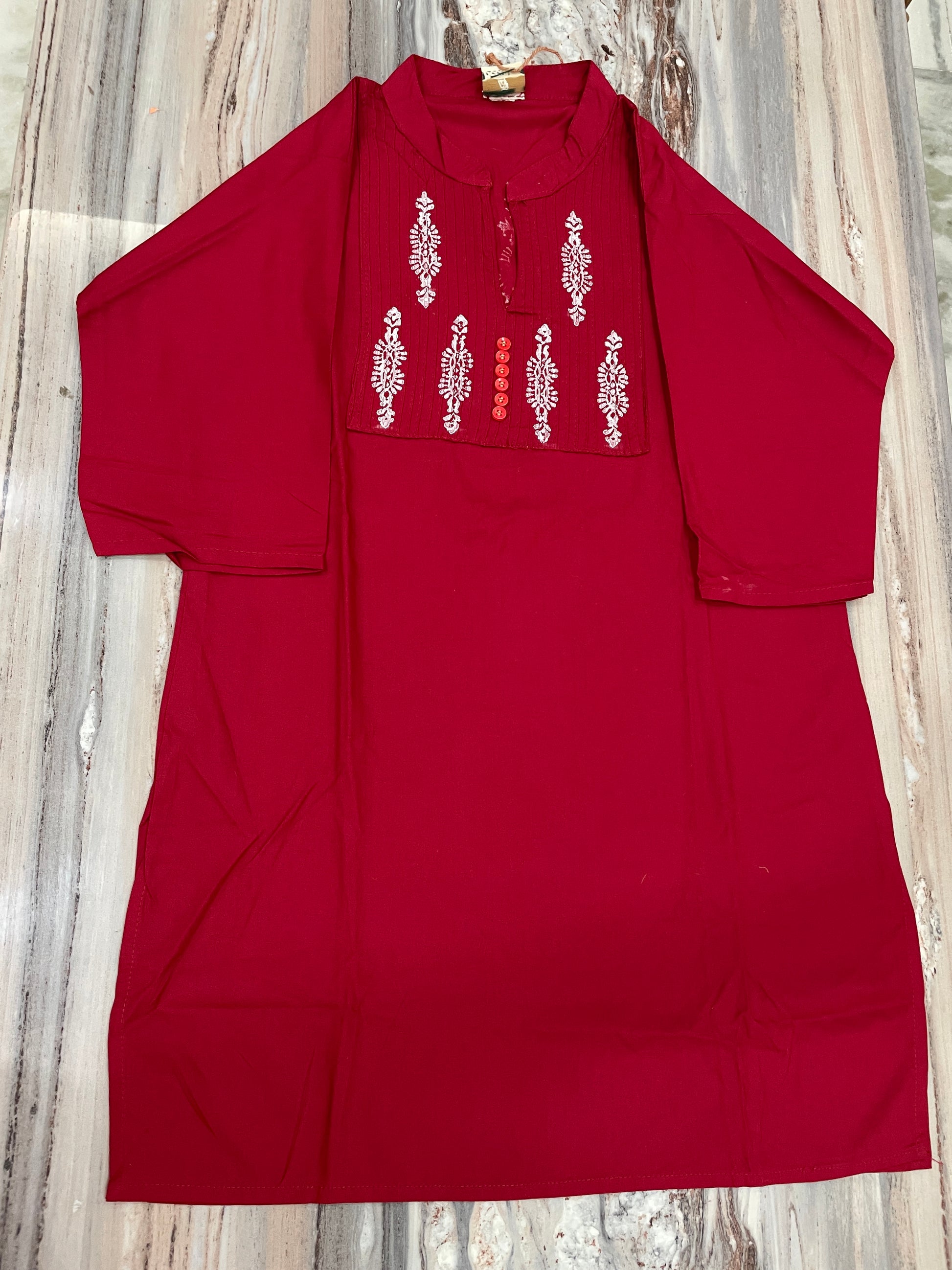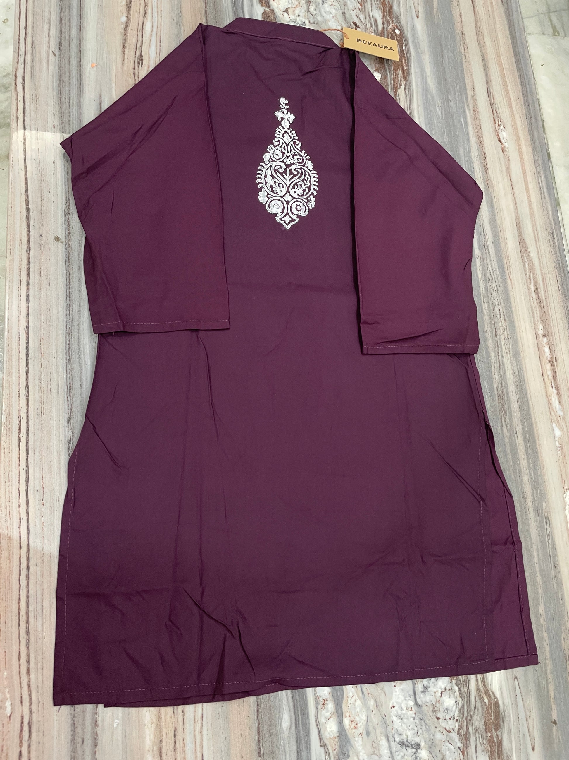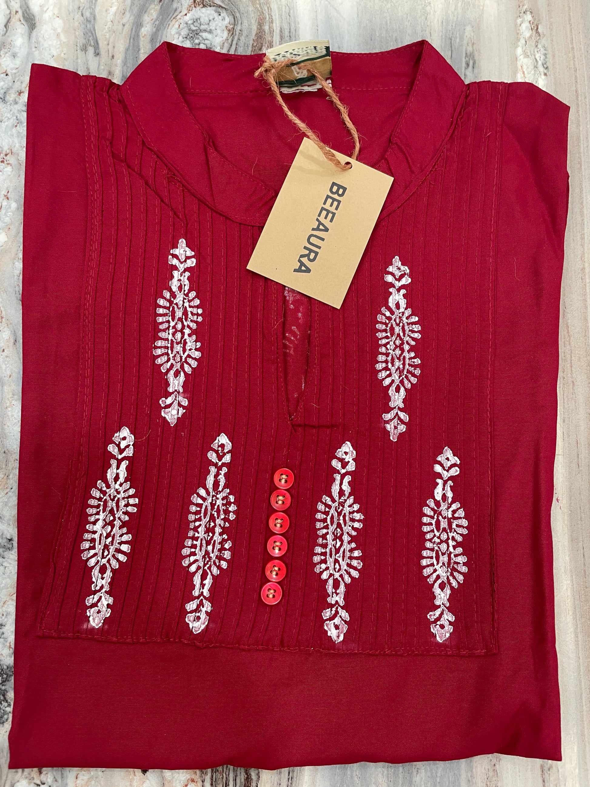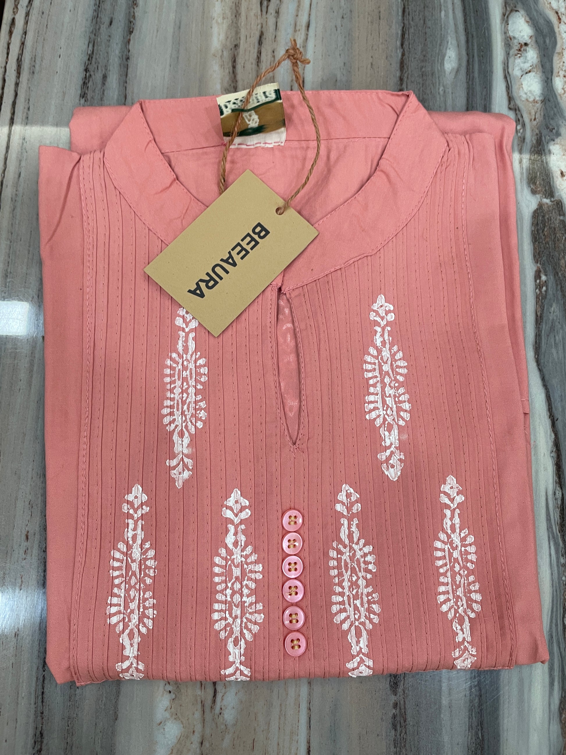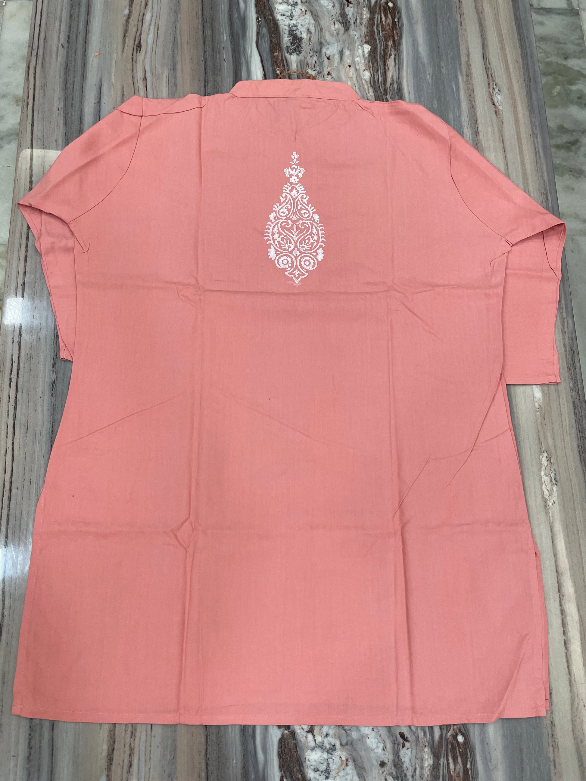 Customised hand block print at front and back of the kurti, with standing collar and 3/4 sleeves. In plain colours which can easily be worn on jeans, palazzo or formal pants. Be it any small festival , party or meeting perfectly suits any event.