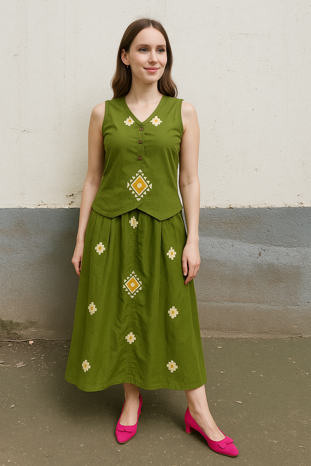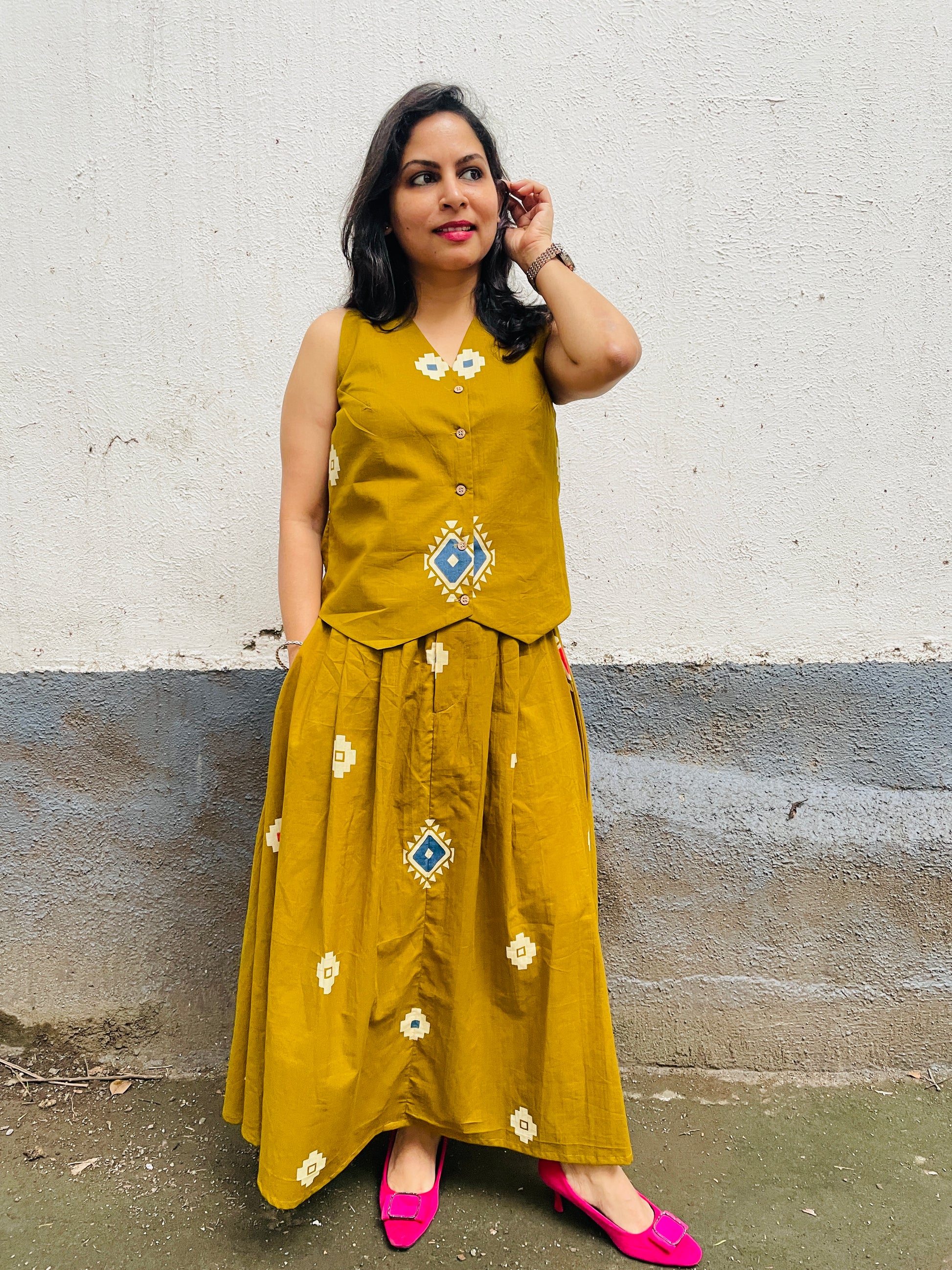 BEEAURA Introducing Sleeveless Vasecoat top and skirt with comfort fit. Front buttons for the top and Side pocket, zip for the skirt make it more easy n trendy looking outfit.Available in 5 earthy colours(mustard yellow purple, maroon,green&blue)
